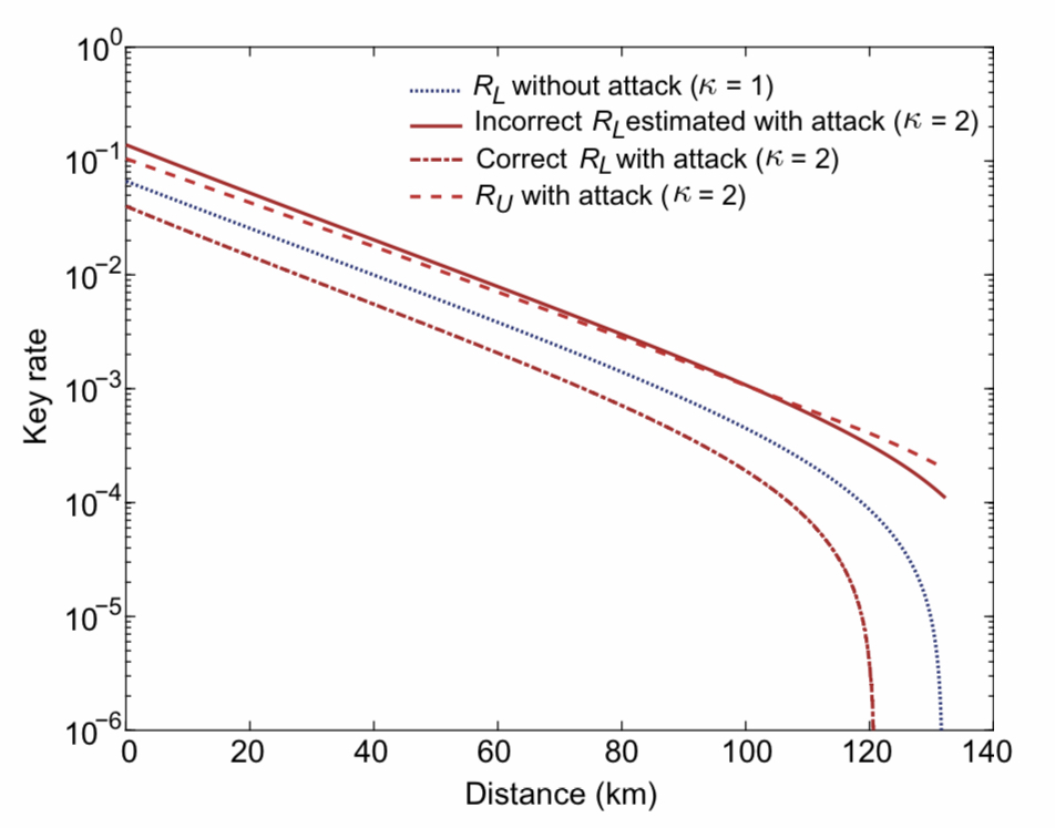 图中的红色实线是量子通信双方之间自己以为安全的下限曲线。在这时候量子通信的实际安全性已经远远高出安全下限曲线RL(红色点划线),这表明量子通信在这种状态下是得不到理论安全性保证的。不仅如此,量子通信的实际安全性在大多数情况下甚至高出安全上限曲线RU,这表明量子通信在这种状态下实际上是不安全的。