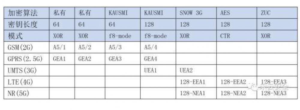表格展示了各代移动通信网络保护手机语音和数据私密性时使用的加密解密算法、密钥长度和加密模式(流加密、块加密)。这些加密技术全都属于传统的对称密码系统,隨着移动通信技术的升级换代,加密技术也有了长足的进步。到了LTE(4G)时代,国内移动通信网络的加密算法使用非常现代和成熟的三种技术,AES是久经考验的国际上通用的对称加密算法,SNOW 3G是在移动通信网络中经过不断完善升级的流加密算法,而祖冲之算法(ZUC)是中国自主开发的加密算法。