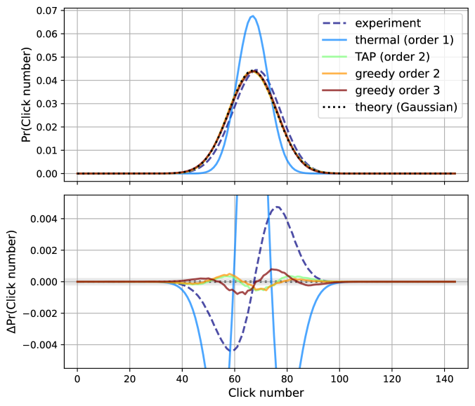 请看论文中的图片3。图中的黑色点线和紫色虚划线分别对应于理想分布曲线和光学实验结果,颜色为兰、绿、橙、棕的直线分别为一级、二级和三级近似的经典计算结果。从图的上部可以看出,二级以上的近似计算结果更吻合理想的分布曲线,图片的下部显示各种方法得到的结果与理想分布的统计偏差曲线,从中不难看出“九章”实验结果与理想分布之间的偏差远大于二级近似的计算结果。
