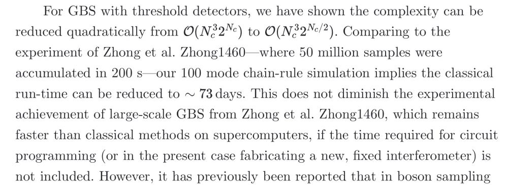 1)英国学者提出的经典算法针对的是理想化高斯玻色釆样的物理过程,由此得到的结果远比“九章”之类的实验结果精确可靠。当然经典算法也可充分利用“九章”实验中“光子损失”、“光子可区分性”等等缺陷和漏洞,在保持计算精度优势的基础上进一步提升计算速度,让“九章”所谓的量子优势成为泡影。