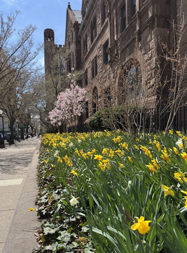 到了耶鲁,照例女儿总会领着我们去校园中散步。这次给我印象最深的是一片片淡黄色的水仙花,它们伸展在庭院小径的两旁,紧贴着厚重典雅的外墙,给耶鲁的早春增添了欢乐向上的气息。女儿告诉我,当看到水仙花的绿色嫩芽破雪而出,就知道春天已经临近,水仙花朶是美国新英格兰地区早春的经典标志。