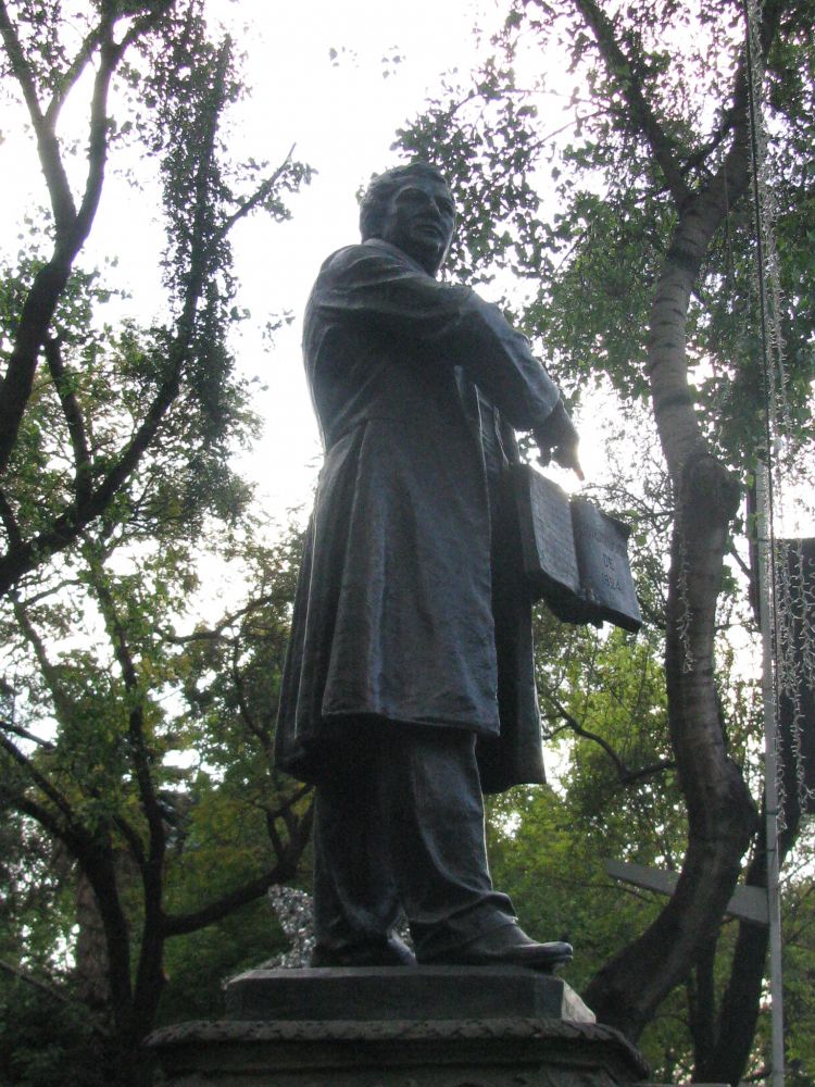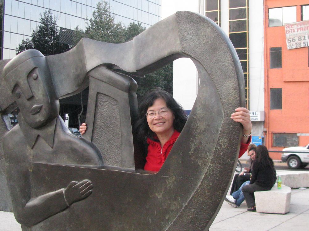 眼镜失而复得,coco很高兴,我也为她找到眼镜而高兴。我们继续超前走,边走边照边欣赏。这条街道两旁的人行道上隔不多远就有不同的石头人物雕塑,栩栩如生,形态各异。既有长着翅膀的天使,又有佩剑的勇士,还有骑马的战士,也有美丽的少女,,,,。两边的建筑也颇具现代化,还有一些雕塑非常有趣,人站在后面,头从空隙之间露出来,拍照,就是一幅很独特的照片。再看,有些宫殿式的建筑,更是吸入眼目。墨西哥城实在是一座古典和现代有机地结合在一起,美丽的艺术之都。面对古老而又尊严深幽的建筑,会让人不由自主地浮想联翩。这座曾经世界上的第一大都市,自有着她的辉煌和骄傲。我这才看了一点,已经感到不虚此行了。
