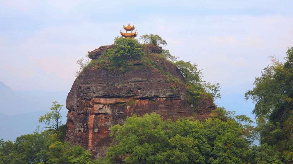 香炉峰:因重力崩塌、 流水风蚀作用而形成的柱状丹霞地貌风景,海拔410米,形如巨型香炉而得名。峰顶有一铁亭,重达万斤,相传为明太祖朱元璋赐建。