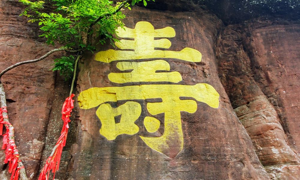 寿字岩的寿字为南宋理学大师朱熹所题。寿字体浑厚圆润,高九尺九寸, 宽六尺六寸,与周易卦数相合, 阐阴阳和合之理。 听导游说“寿字下面走一走, 延年益寿九十九, 寿字底下摸一摸, 健康快乐一百多”,机不可失,赶紧走走摸摸再留影:)。