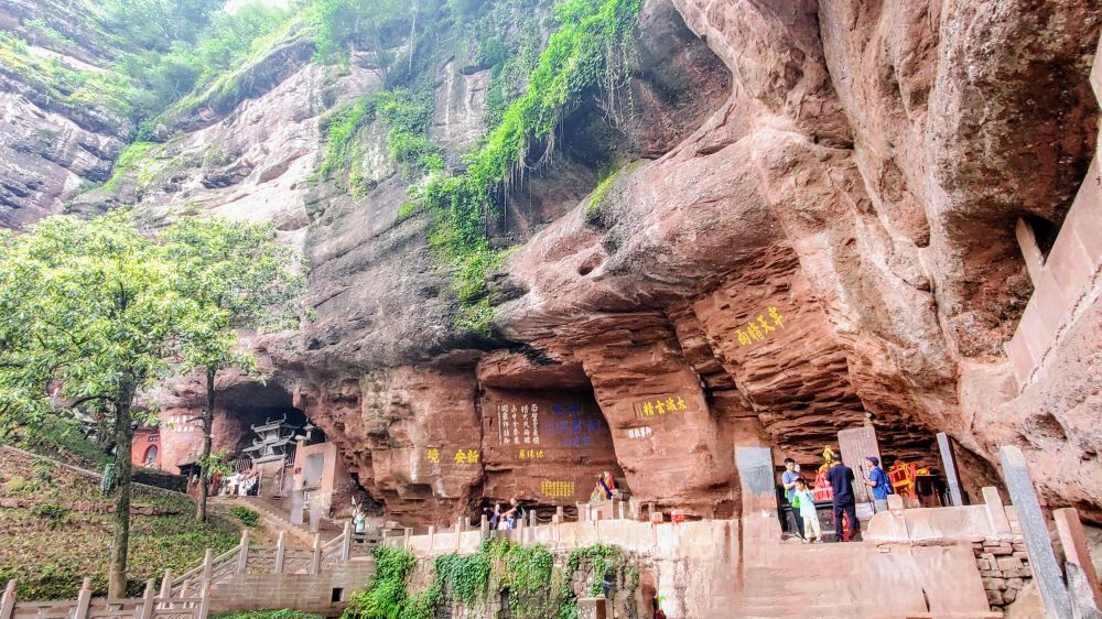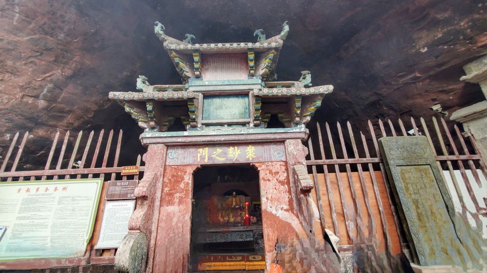 崖壁下有许多天然洞穴,供奉各路神仙塑像。导游介绍有道教的真武帝和八仙、佛教的南海观音、民间的海龙王和文昌菩萨。 没能将每个洞穴与名字一一对上号,却感受到浓厚的儒、道、佛三教和谐共存的气息。
