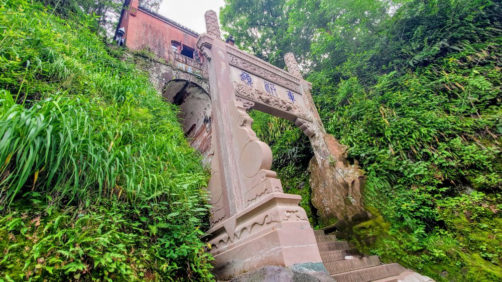 走着就到了二天门。它建于黑虎崖上, 巧妙借助自然地势, 用红麻石砌成两道孔券,形成门户; 下方凿石砌阶以登, 因地形狭窄, 如同一道车辙, 故称车供岭。