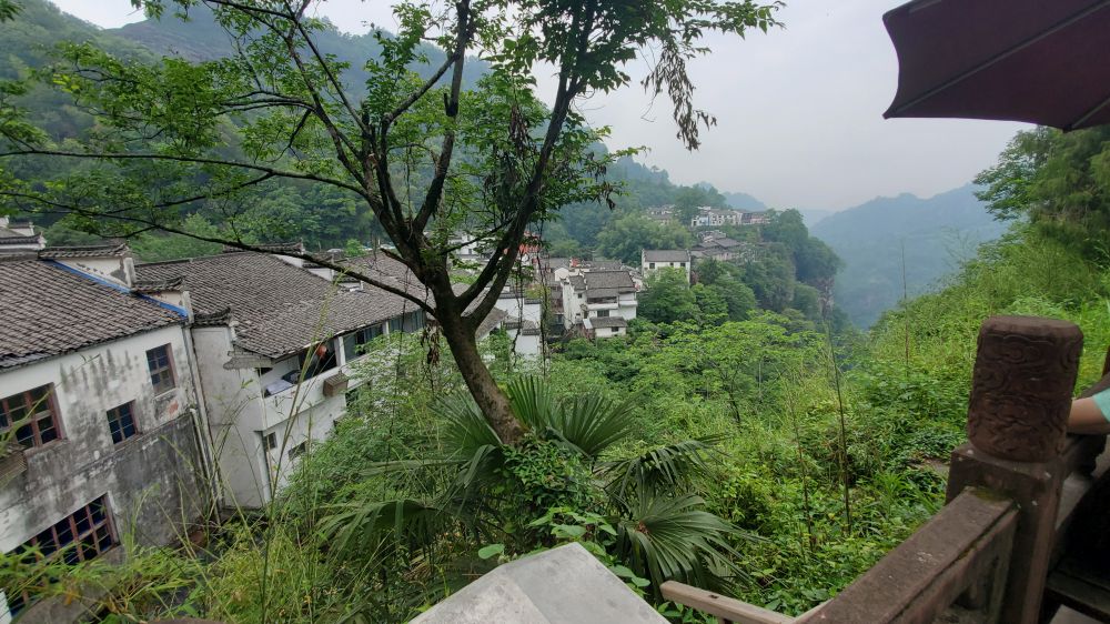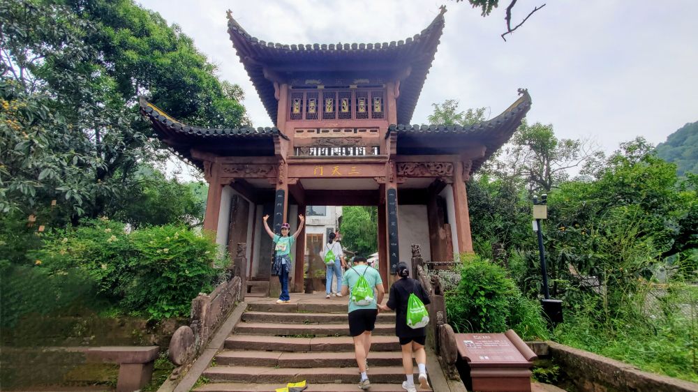 听我说月华街上最想看的是小壶天,导游大笑,说那里是她家后院。导游家很大,经营民宿,一面正对香炉峰,风景极佳。穿过她家前行不远,便来到小壶天胜境。小壶天门坊,修建于明朝正德年间,里面的空间原有建筑,称“睇元阁”,公元1616年正月三十日,徐霞客受道长汪伯化的邀请,曾在此饮酒看景。