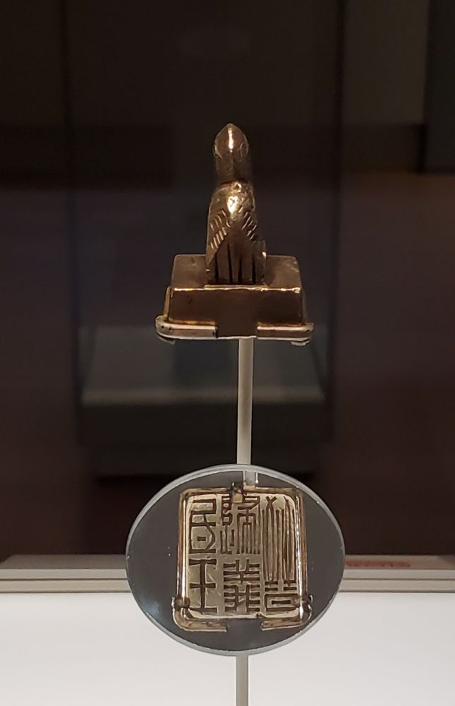 #17 晋归义氐王: 此金印为西晋王朝颁发给归附内郡的氐族首领的官印。据博物馆介绍,秦汉时期,中原王朝根据与周边各民族不同的关系制定了一套有别于内郡的官印制度,用于赐封归附中原王朝或相互修好的部族首领。以金、银、铜质及王、侯、君、长的官号区别不同等级,又以驼、马、羊、蛇钮式作为不同族别的标志。三国、魏晋仍然沿袭了这一制度。