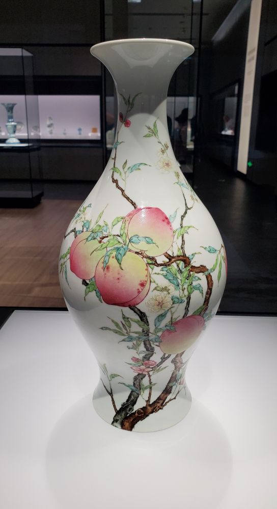 #18 粉彩蝠桃纹瓶:景德镇窑清雍正年(公元1723-1735年) ,由张永珍女士在国外拍卖会上购得捐赠。
