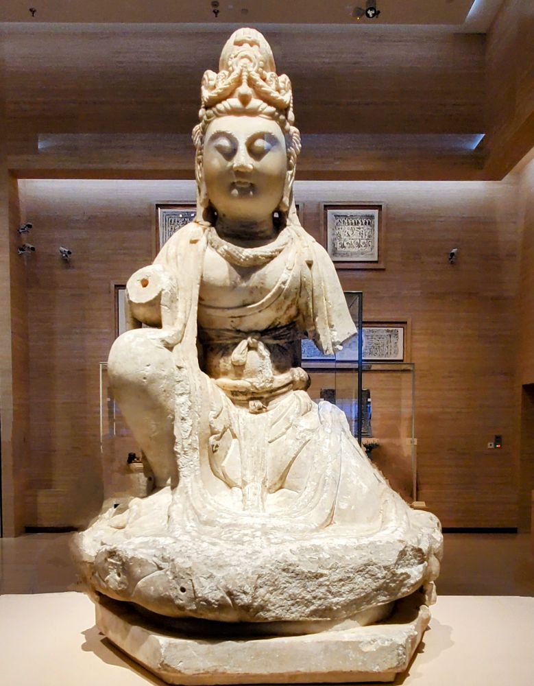 #19 供养维塔木特尔的菩萨: 唐(618-907)菩萨面呈满月型,表情安祥。细腰长裙,褶襞自然流畅。以大理石的细腻材质, 充分展示肌肤柔软弹性的质感。