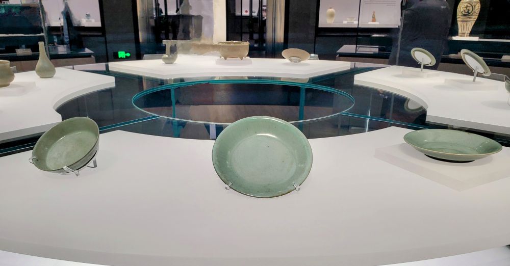 #21 青釉盘: 汝窑北宋(公元960-1127年), 汝窑是宋代五大名窑之一,以烧制青瓷闻名,特别是北宋汝官窑。汝窑瓷器以其独特的釉色、精湛的工艺和稀有性而著称。