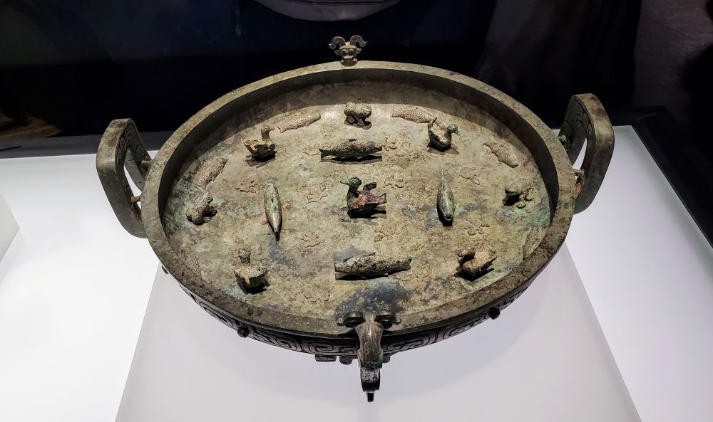 #5 子仲姜盘: 春秋时期的青铜盘,为古代举行净手之礼时承接弃水的。盘中共铸31个水生动物,当净手弃水流下冲击到盘内小动物时,它们便像鱼一样游弋其间。脑补一下那个画面,很美妙!