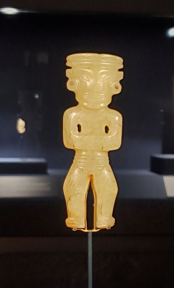 #16 神人: 石家河文化(公元前2500~前2000年),头戴平冠,耳佩环饰, 双手交于胸前,再现史前巫师或部落首领举行祭祀仪式时虔诚与神沟通的形象。展品很小,位于玉器馆入口处。