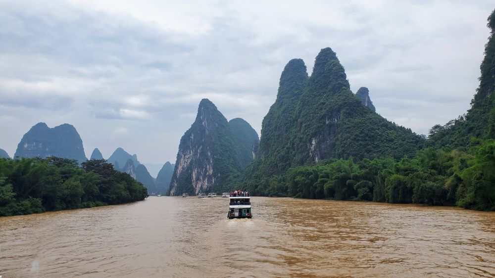 终于坐上了心心念念的漓江游船。磨盘山客运港(竹江客运港)上, 阳朔县域的龙头山码头(水东门码头)下, 航程63公里,约3.5 - 4小时。