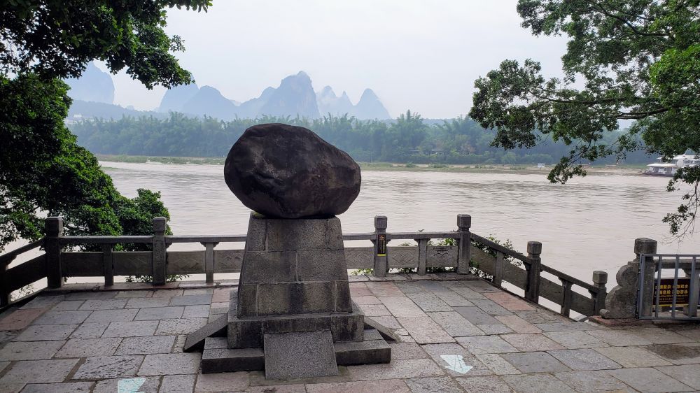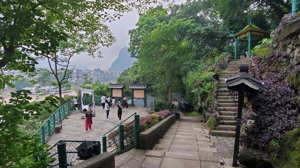 我做功课未发现此处。沿江的景区尚未开门,里面只有几位当地居民在晨练, 很宁静。一路进去,发现了不少宝贝。拍《刘三姐》抛绣球的阁楼,周恩来、陈毅、邓小平等游览休息的亭子和照片,还有许多年代已久的碑文石刻。