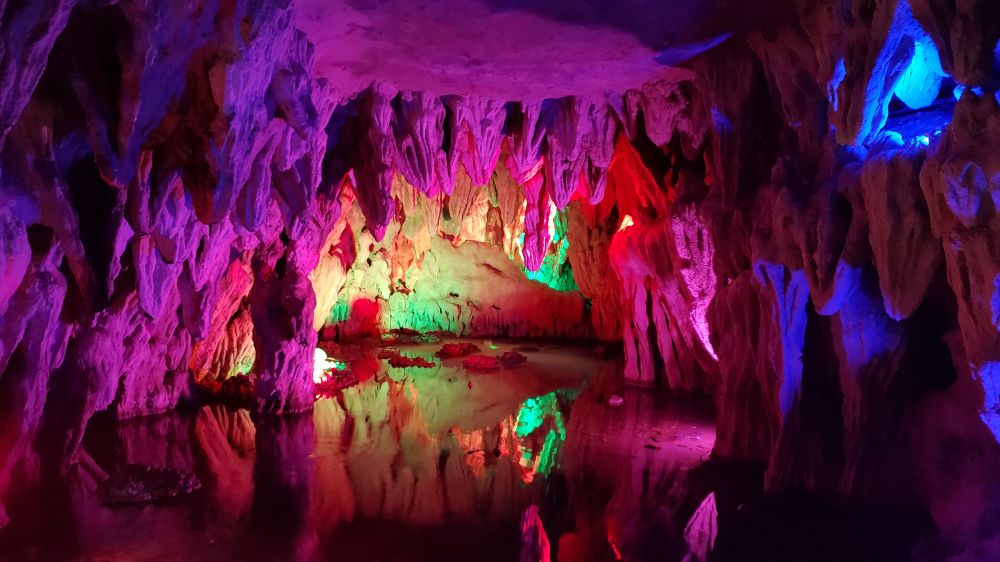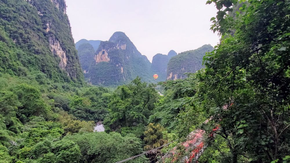 与他处的钟乳洞无异,钟乳石林立,石涧涓涓清泉潺潺,五彩灯光下奇峰叠彩、洞穴生辉。嫌人多拥挤,出洞后开始独行。外面空气清新,微风清佛。穿山道曲径,跨云中吊桥。南天门观景台附近果然山奇峰秀,但距“俯瞰十里画廊全景”,尚有距离。