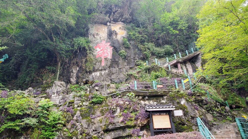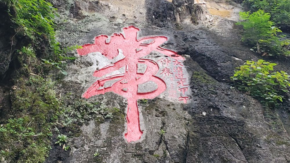 意外的惊喜是悬崖上面刻着的一个大大的“带”字,高5.73米,宽2.91米,系书圣王羲之后裔、清代阳朔知县王元仁所书,一个“带”字中藏有16个字。