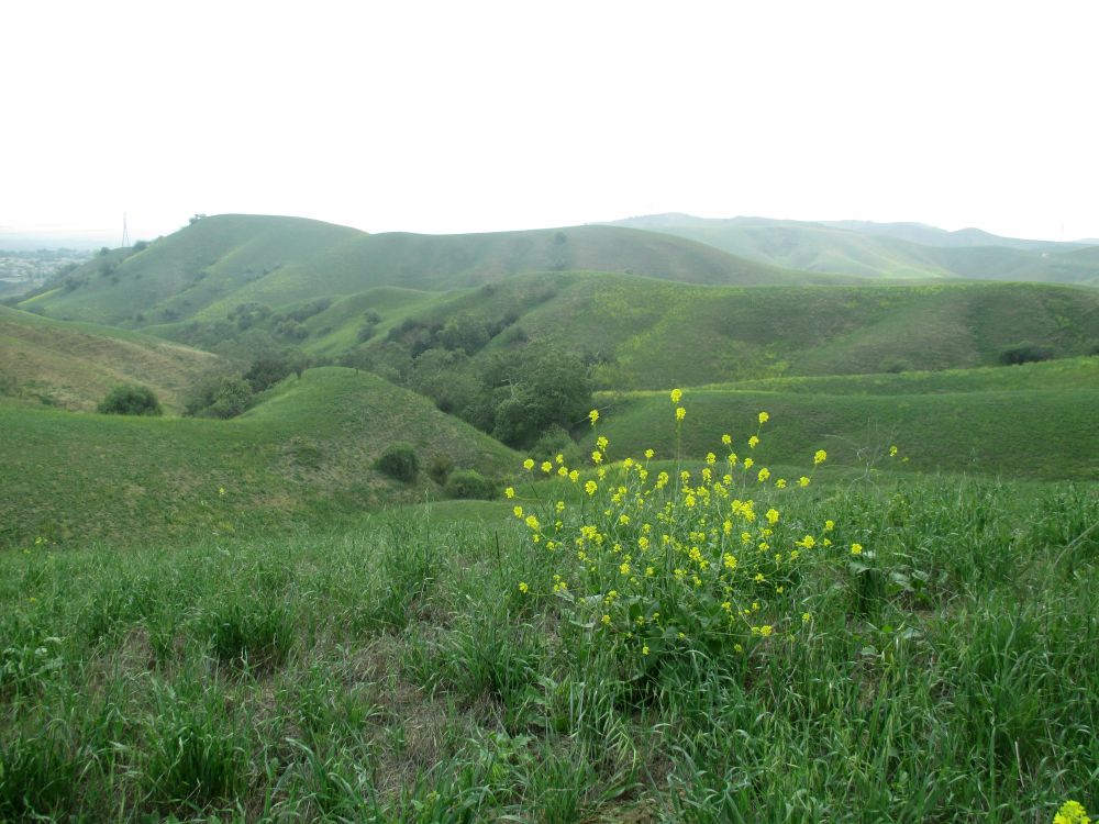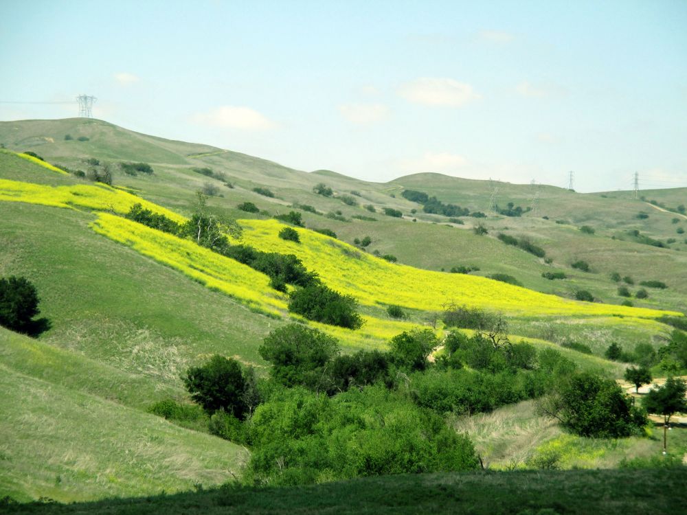 上个星期六我们几个附近好友去我们小区的后山州立公园爬山。因为公园有电力公司在修什么东东, 公园靠我们小区这边的大门关闭,还听说擅自进公园的一些biker和hiker还被sheriff开罚单。因为是我们住在小区的后面就是这个公园,我们知道能从小路进去。为了不让公园警察逮着, 我们寻到并绕着偏僻小山路走, 谁知却看到令人不敢相信的美景, 满山遍野都是花, 有白,粉,紫色的花海, 还有各种颜色, 各种花的百花谷, 最令我们发疯的是那片藏在深山里的黄色野生芥末花海(black Mustard), 连绵不断的芥末花开满了半个山坡,远远看去就像远山覆盖了一块美丽的黄绸缎, 鲜艳夺目。