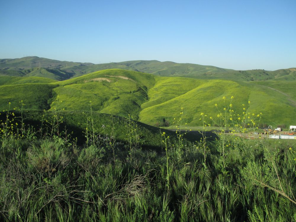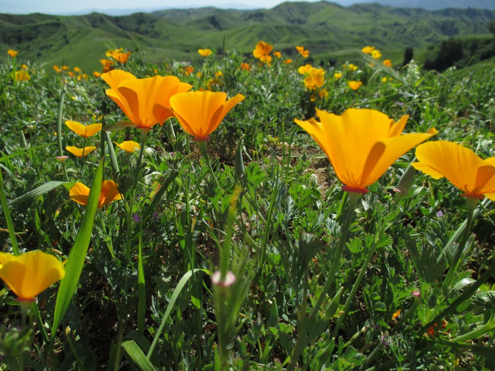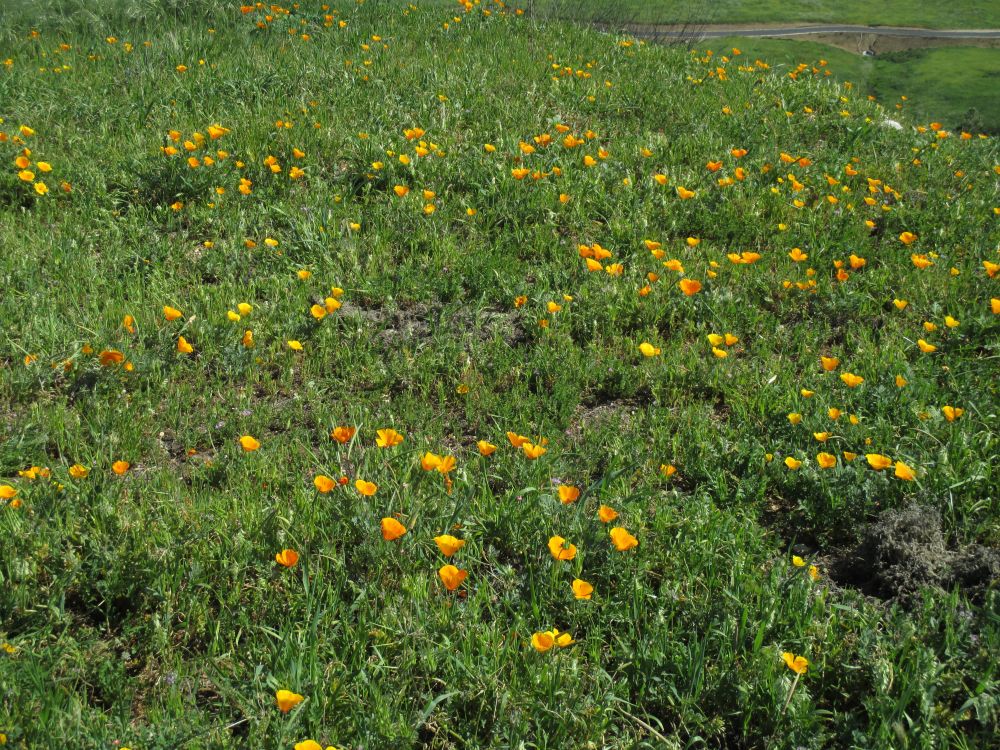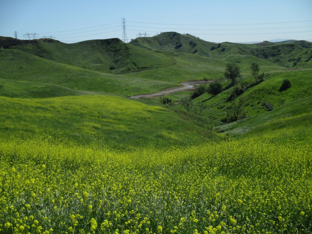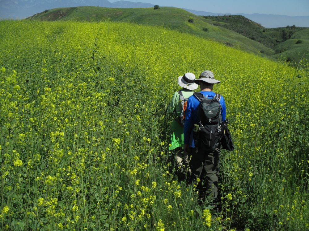 加完油,我们继续沿着对面的山脊往回走。今年这里的花儿都集中到了北面的山峦盛开了,有成片的小黄花,加州州花Poppy,鲁冰花,无名紫色花,紫色bell花,,还有就是盛开的象油菜花的芥末花海。
