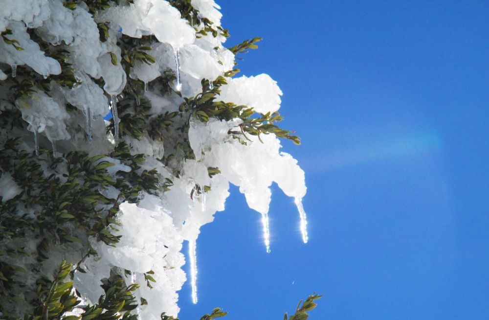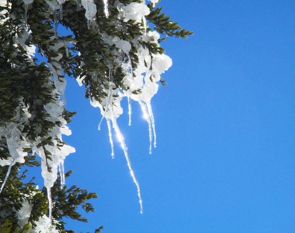 越往上爬,高处的雪景越美不胜收。山上白雪皑皑,林海雪原般的松树身披白雪傲然挺立,松树上挂着晶莹剔透的串串冰棱,如水晶珠链、又象水晶悬剑,在阳光的照耀下泛出圣洁而冰晶的光茫。 阵风拂过,摇落满树水晶珠串,刷刷声中无数闪闪的晶光滑落,就像阳光的碎片如雨滴一样洒落, 树下尽是掉落的冰挂,雪球与白雪混在一起, 煞是好看。