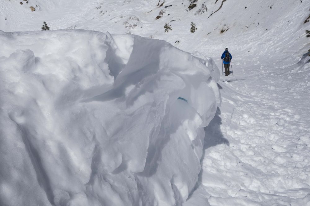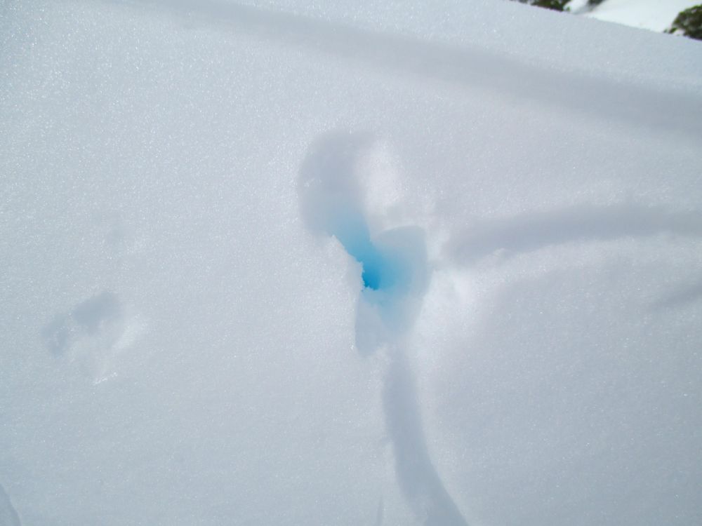 雪是那么的洁白,路边白雪被山风吹起了半人高的雪墙,我用登山杖往雪墙上戳一个洞,就看到蓝莹莹的雪洞