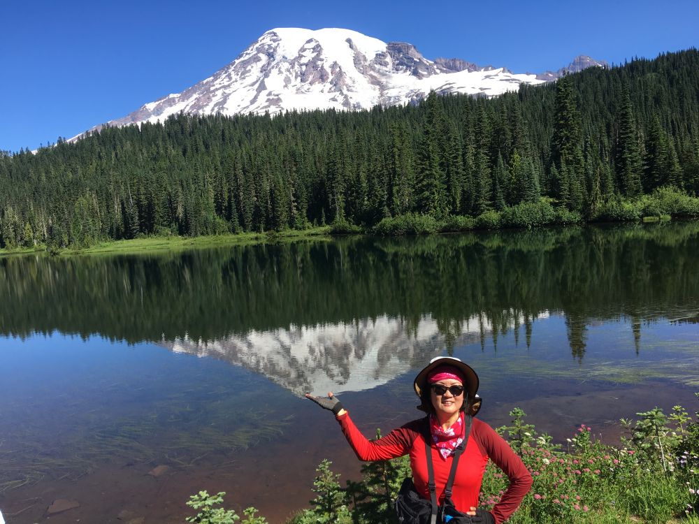 今天又经过倒影湖,前天去的时候有风,有波纹,水面没有雷尼尔山的倒影,今天风平浪静,雪白的雷尼尔山静静的画在这一碧湖水里,我们大家都拼命照相
