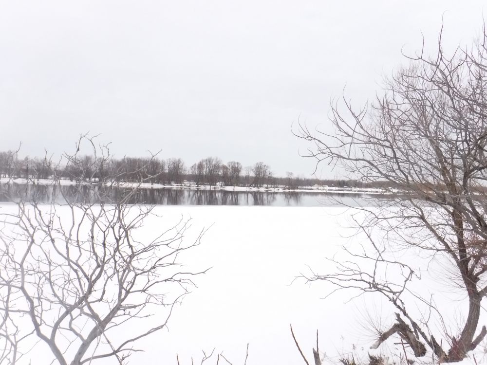 河面近堤处结了冰,冰面上积了雪。中流依然是河水,极安静,河面上没有波纹。小岛停立在河中心,只高出河面些许。岛上枫树,在冬天只见枝干,愈加挺拔。树林疏朗,清晰地倒映在水中。四野皆是积雪,因天空略有薄阴,正好晴朗而不炫目。气温在零度左右,空气因寒冷而更加清新。天地广阔,此时大自然的景物无一不宁静温和,让人开朗喜悦。