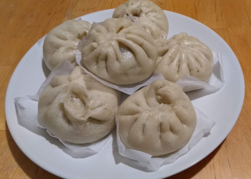 四、蒸包子。水烧开后,放入蒸屉,盖上盖子。调成中火,蒸二十分钟后停火。等五分钟后再揭开锅盖。包子蒸好了!