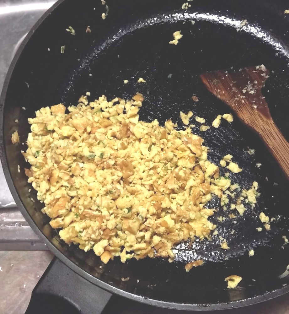 5. 取两个鸡蛋打成蛋液,加少许葱花和盐,用植物油炒熟炒碎。