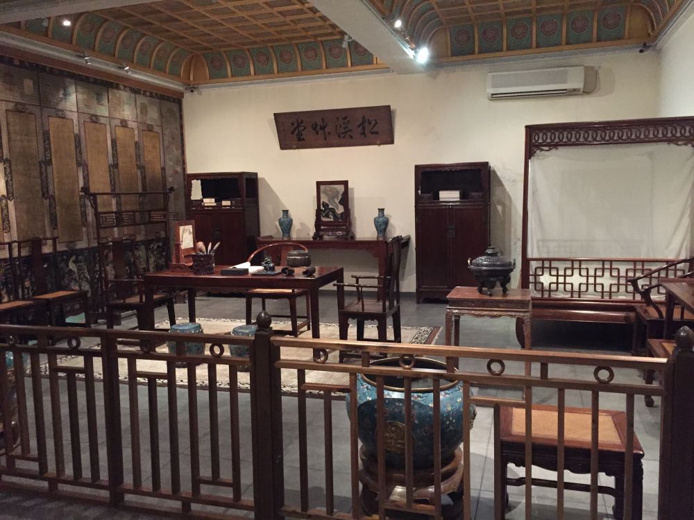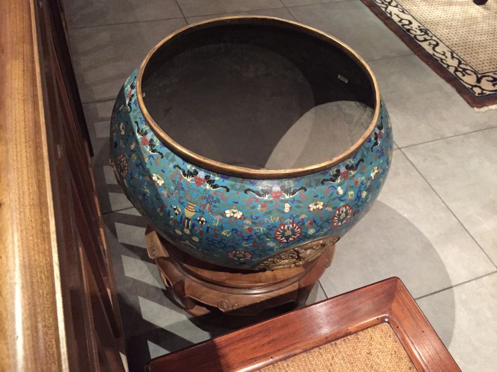 里面有几个厅,分别摆放着明清时期的黄花梨,紫檀和老红木家具,家具旁边或顶上陈列些景泰蓝等别的古董,大小不一,颇为壮观。