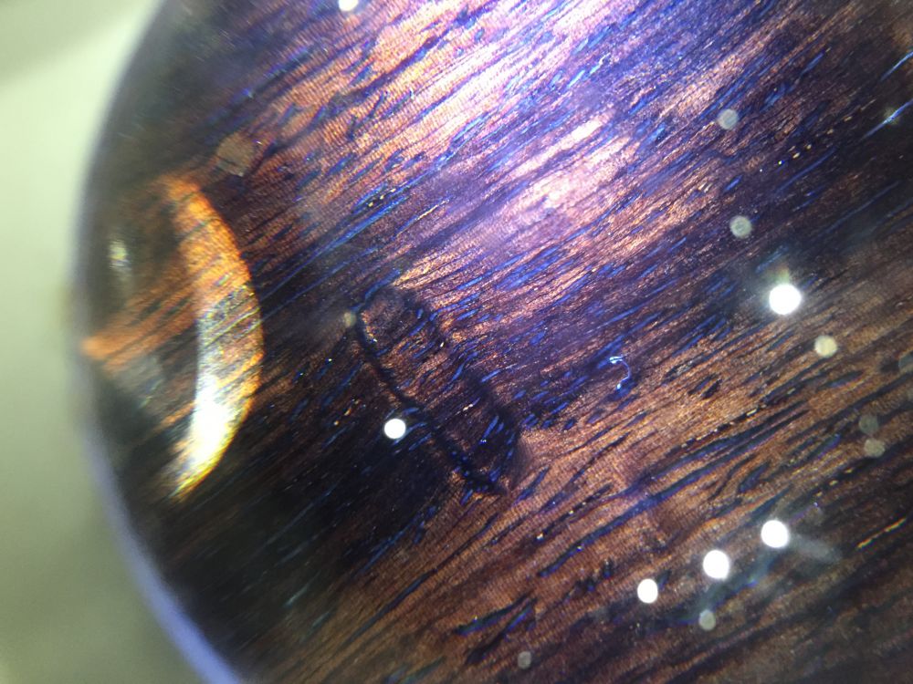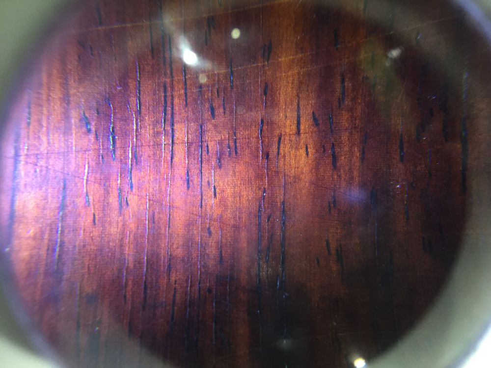 对于初学者,鉴定红木是个问题,LD偶然发现用6-8倍的放大镜看红木表面时,会看到均匀的与木纹垂直的细纹,排列整齐,越是好的木头,纹路(线间距)越小且清晰。在别的木种上看不到这种线。用这方法在买较新的红木家具时非常有用,有的厂家在不太显眼的地方使用杂木染色,用放大镜一看就清晰了。具体种类的鉴定就另当别论了。这回正好验证一下。