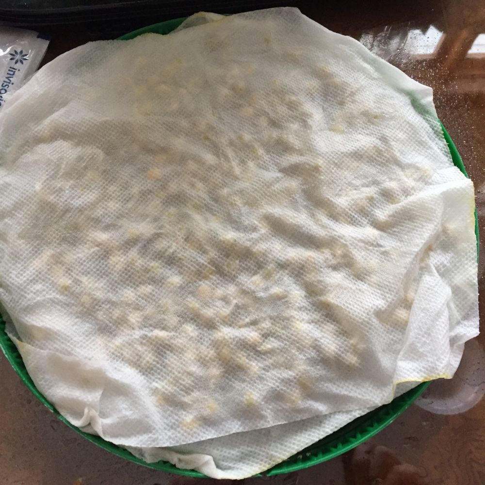 先把豆用温水泡一晚上,找个大桶盖(我家这玩意超多,因为经常买五加仑一桶的compound,可惜以前都扔了),塑料的大蛋糕盒一类的东西做容器,铺上两层厨房用的厚纸巾,然后把豆撒在上面,喷些水,在表面盖张厚纸巾保湿。