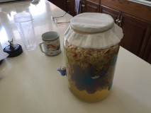 喝起来苹果香味浓郁,没有商业的酸,肯定是糖加少了,但太酸了也不好喝。酿酒跟酿醋的前期步骤一样,只是一直需要氧气,所以封口时要透气(酿酒后期不能有氧气)。因此,容器就简单多了,有个大口玻璃瓶就行。