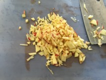 说干就干,把家里没人吃的苹果们翻出来,洗吧洗吧切碎,装瓶,加水、糖,正好当时在酿菠萝酒,尚在一级发酵期,里面酵母含量颇高,于是淘了一勺倒进去,放在大瓶里,就等着看苹果们发酵吧。。