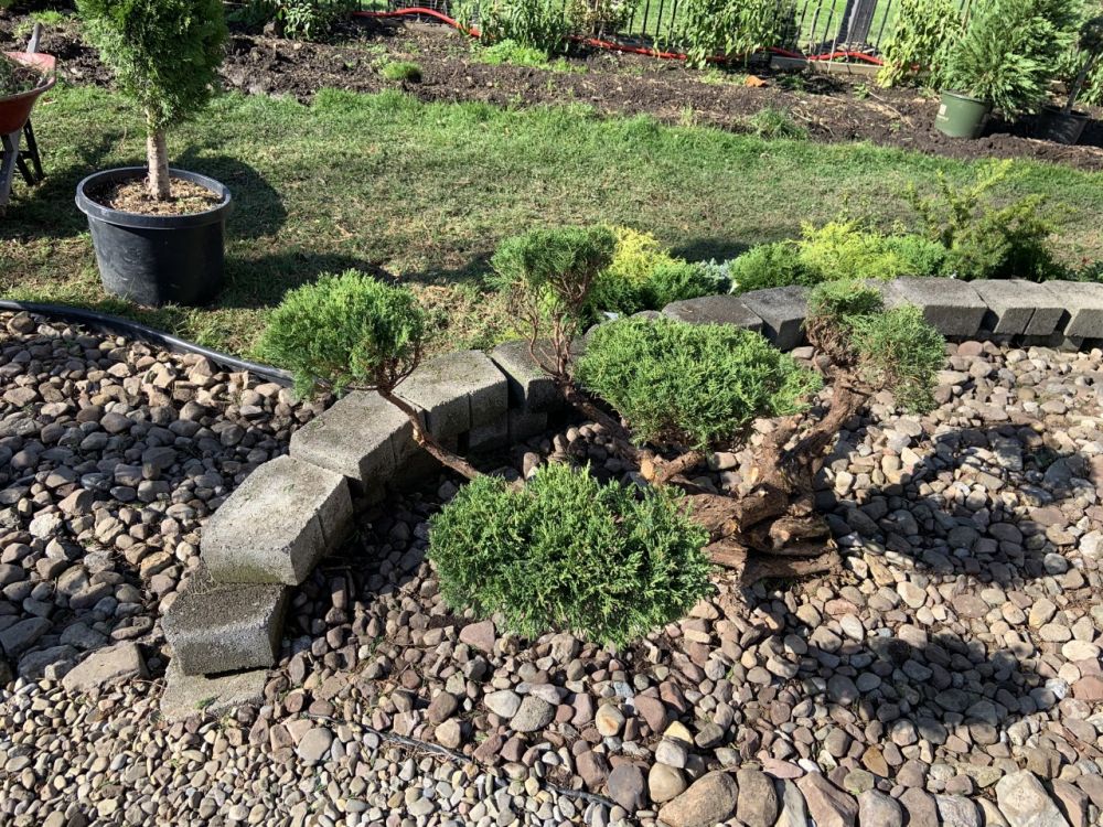 嘎嘎,笑死我了,家中领导赞扬一句,让地主兄干劲倍增。容我一支筷子吃藕---专挑眼儿,小松树很漂亮,但一眼望去,地面绿色太少,灰蒙蒙的,如果部分条状地块换上白色石头子,有个变化,会不会好些?