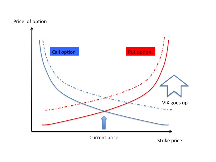 手绘一个简图,说明这个道理。下图蓝色是做多的call,红色是做空的put。两者交叉点接近现在的价钱。当VIX升高,市场情绪认为最近价钱波动会变大(不管向哪个方向),option的价格双双上涨,从实线位移到虚线。向今明两天Fed会前,就是走这个过程。等“重大消息”出来后,悬念没了,VIX下降,option价格从虚线下移到实线,即便股票或指数位点没变,也会多空双杀,坑那帮凑热闹、起哄的赌徒。精明的油条,卖option在出事前,买option在出事后。十二少专门吃曲线上下位移这一口,也正是“VIX高位开空乃大忌”的理论基础所在。