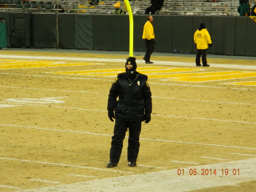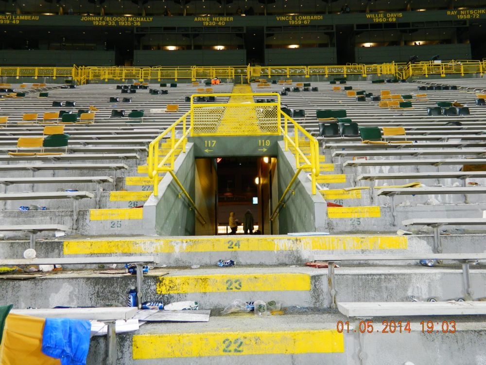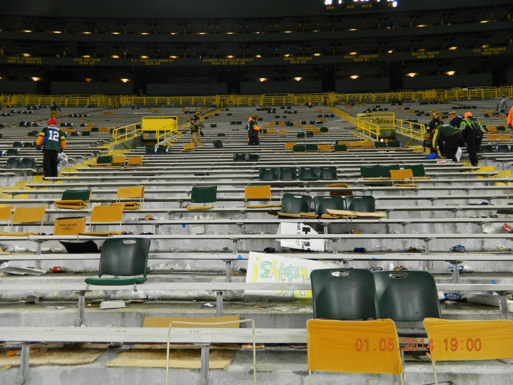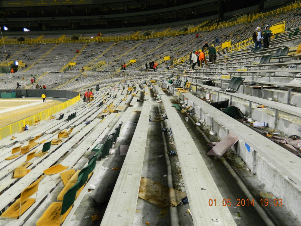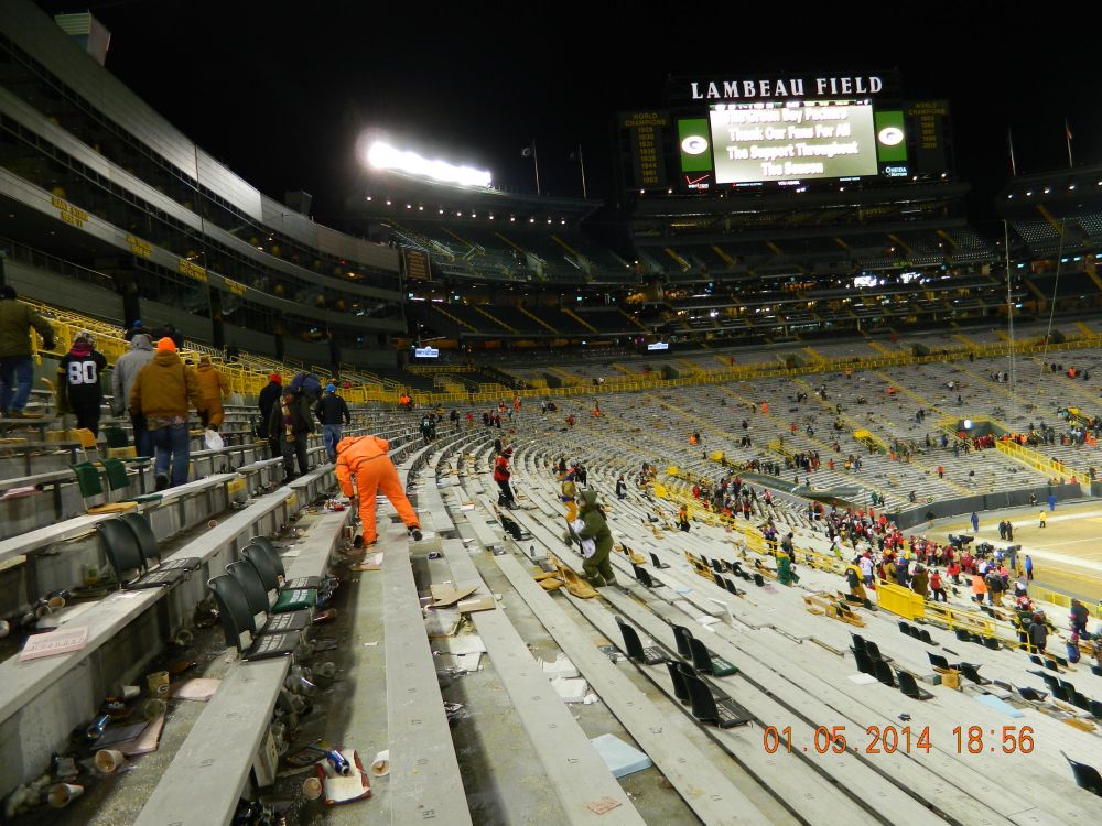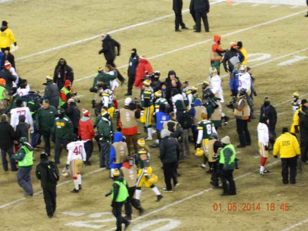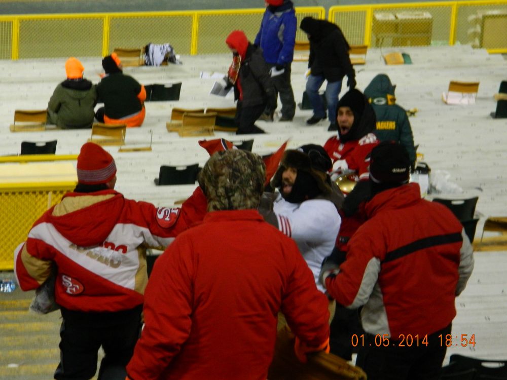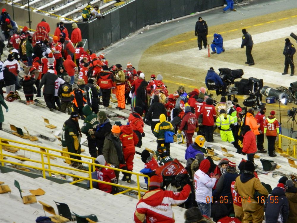 赛后粉们显然很失望,全场没什麽喧哗声。稍后看到49ers粉集中起来庆祝,其实一共没几个。我没有着急走,经验告诉俺再着急也没用,都得在路上耗着,考验耐心。看着泄了气的粉们有秩序地走出球场,我又开始按快门,还跑到前排附近转转,一直转到没几个人了,准确地说是被告知要清场了。