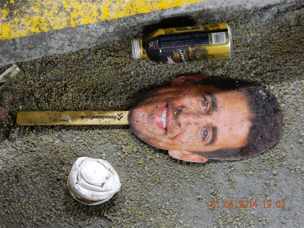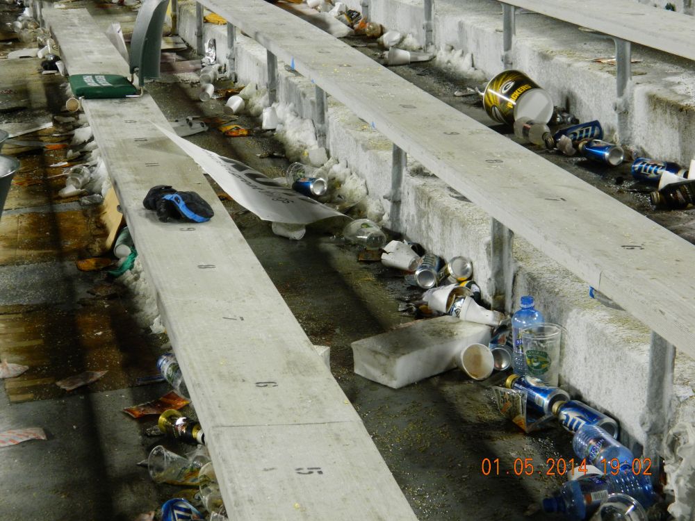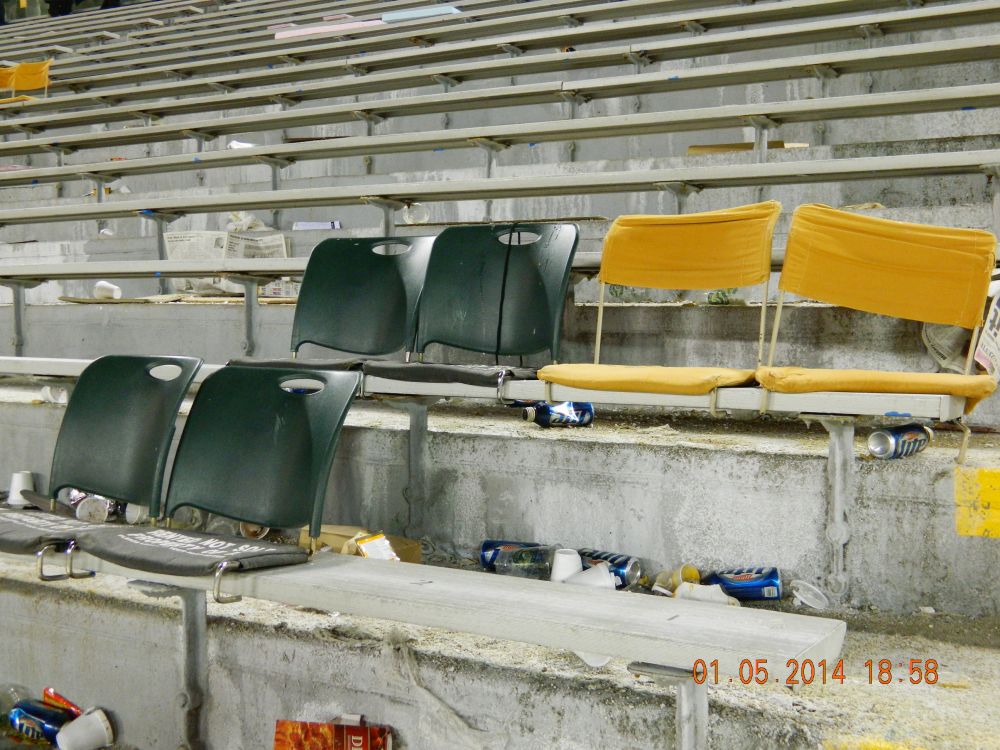 赛后的看台一片凌乱,到处都是这瓶那瓶和各种垃圾。从照片上可以看到可以在板凳上搞一个略微“奢侈”的靠背椅 - 可以自带或花几块钱租。还可以看到保安人员一直立在那里坚守岗位直到基本没什麽粉了。