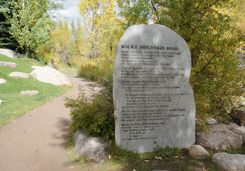 在河边坡地的草坪和树丛里,排列着几个巨大的花岗岩砾石,砾石上刻写着丹佛创作的歌词。2007年科罗拉多州把《高高落基山》正式定为本州的州歌。