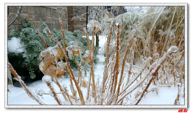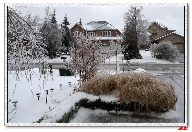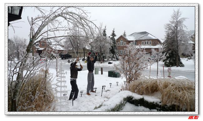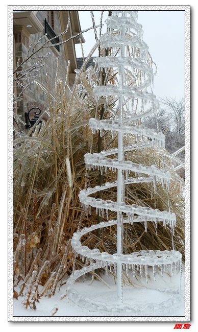 2013年12月21日,多伦多遭遇冰暴、冻雨袭击,持续2天的冻雨给万物披上一层厚厚的冰衣,整个城市像被水晶包裹了一样,满眼的晶莹剔透、玉树临风。在这美丽的背后却暗藏杀机:厚重的冰挂让许多树木不堪重负而折断,压断或扯断电线,造成大面积停电。据新闻报道,大多地区有30万户断电,上百万人陷入“黑””寒“交迫之中,我们就是其中之一。 晚上吃过晚饭,刚收拾完,突然就停电了,刚开始断电时还觉得很好玩,点上蜡烛,几个人围着蜡烛打扑克牌、聊天到深夜。第二天早上醒来,发现还没来电,好在家里是煤气炉,可以用打火机点火做饭。虽然室内温度降低到18度,也还没觉得太恐怖。 吃了饭出门一看,惊呆了,门前近10米高的树因为冰坨的压力,已经弯到了地上,但是还没折断,赶紧拿了木棍,敲打树丫上的冰,虽然很多细小的枝桠随着冰坨一起掉下,但是为了保住主干,只能继续敲打,最后树挺起来不少,但并未完全挺直。
