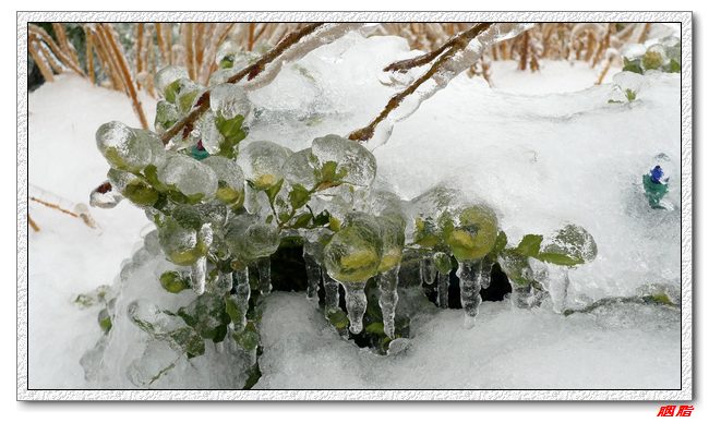冬青树墙已经被冰雪围住,绿色的小树像镶嵌在冰雕中,晶莹的冰中透出点点绿意。