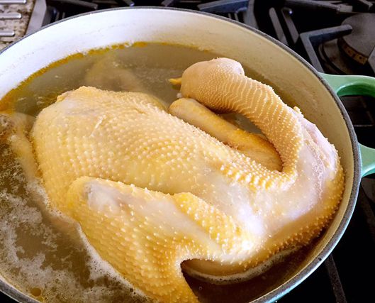 制作口水鸡,首先是煮鸡,然后是配制调味酱汁。