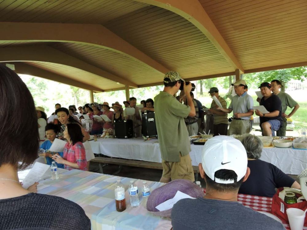 除了古董车,还有一个亮点大家是饭后才知道。今年是知青协会成立10周年,协会已经安排8月6号在新财神举办庆祝餐会。理事会计划庆祝会上全体合唱当初成立时创作的《知青的歌》,所以烧烤饭后就开始组织大家练唱。在音乐伴奏下,深情委婉的歌声在大棚响起:“青春并不遥远,往事犹在眼前,大地留下足迹,江河倾诉悲欢。……”当唱到“当初的你和我,当初的知识青年”,不少朋友已经湿润了眼眶。是呀,那是我们不可忘记的艰难岁月;那是我们始终牵挂的浪漫胸怀;那是我们永远珍藏的纯洁青春; 那是我们无法割舍的悠悠情结。就是因为这个情结,我们这些当年的中国知青,在华盛顿地区成立了知青协会。就是这个情结,我们结识了越来越多的热心朋友。就是这个情结,我们协会一起走过了快乐的10年。就是这个情结,我们在这里放歌把当年的精神天下传。