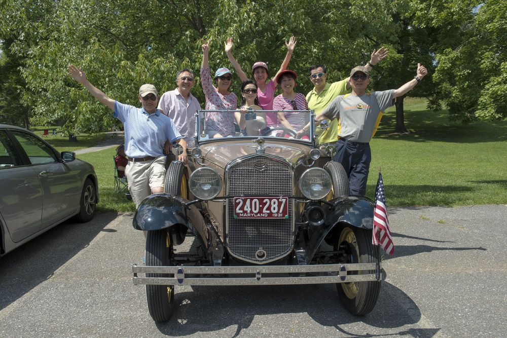 知青协会夏日烧烤活动,从2010年起几乎每年都举办。内容除烧烤和吃百家饭外,主要是餐后的游艺活动。手风琴伴奏唱歌和大家一起做起广播体操是我们例行的节目,还有就是足球,排球,呼拉圈,扑克牌, 飞盘等等一些常见的活动。今年能添点儿什么新花样呢?理事会为此事可费了心。在接近烧烤日的前2天,理事会的提醒通知才透露了一个非常特殊的安排,即有二辆老古董车开来助兴(1931 model A roadster 和 1931 model A sedan) 。这二辆车都拍过电影,其中一辆是奥斯卡影帝小李开过的车,车主欢迎大家拍照留念。这可是一个吸引人的亮点。当天大家一到停车场,就看到这二辆漂亮的老爷车好气派的盘在那里。一时间,人人爬上它们照相留影,还伴随着各种各样的POSE, 让围观者笑喷。