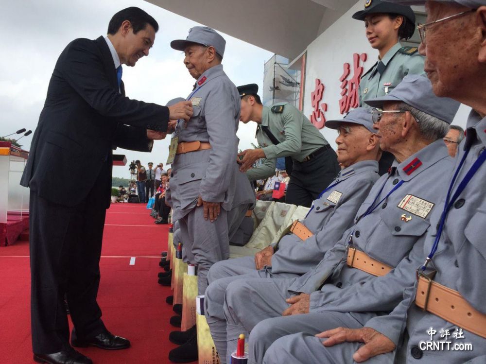 纪念对日抗战胜利70周年,马英九(左)并亲自颁发抗战胜利纪念章给10位老兵代表。(网图)
