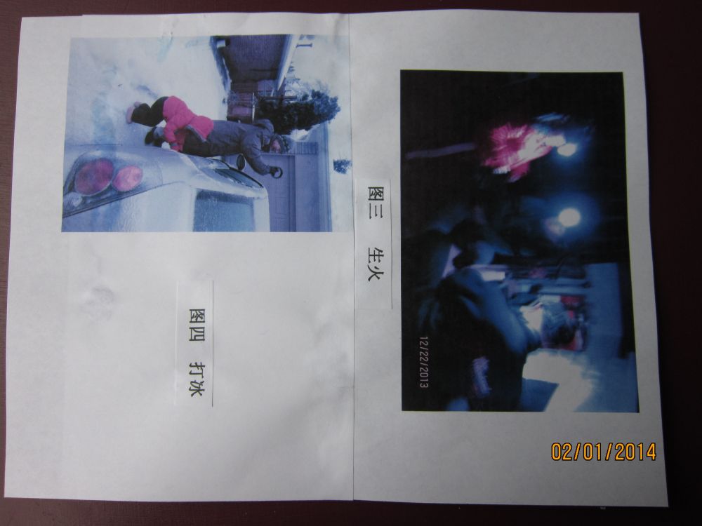 这时,我媳妇和孙女都起床了,媳妇打开手机看新闻,才知道作天晚上多伦多遭遇几十年未有过的大雪雹加冰雨,大风加大雪把很多地方的输电线压断了,造成很多地区停电。多伦多电业局还发布新闻公告,说这次大风雪非常严重,造成的损失不是一下子可以恢复的,大概需要72小时才能完全恢复送电,叫市民赶快采取一切必要的自救措施。72小时意味着3天3夜没有电。在现代社会,一刻也离不开电,作饭要电,烧水要电,取暖烧锅炉要电去控制,我们最初想到的就是尽量保持室内的温度不要开大门,可是一天三餐怎么解决,只好到外面上馆子。我们一家五口赶快穿上严厚的衣服准备到外面就餐,打开房大门一看,坏了,停在外面的汽车被冰雪封的严严实实的,而停在车库的汽车,因为没有电,打不开车库门,也开不出来。怎么办?我儿子想了一会,对我说:“爸,你来帮忙,和我一起用锤子把外面汽车一个车门周围的冰打碎,只要打开一扇门,我进去发动汽车开暖气,就慢慢地把其余车门的冰化掉,我们就可以开车出去吃饭了。”说着,儿子就回家找锤子去了,同时叫我爱人,媳妇和孙女回家,但是他们都不愿意回家,要在外面陪我们。不一会,儿子出来了,手里拿着两只行李车的胶轮,把一只给我,我俩就全力敲打车门周围的冰。那冰也不是那么好打碎的,冰层大概有一公分多厚,我孙女见状,也拿起从旁边捡到的树枝,帮助我们敲打车门(图三)。我们齐心合力地工作,我儿首先打碎一个车门的四周门缝的冰层,用力把车门拉开,他钻进汽车,发动汽车取暖,接着,我也打碎后门四周的门缝上的冰层拉开车门。儿子发动汽车后,又出来敲打汽车前后玻璃,这时我们全家一起动员,合力清打汽车全身的冰层,小孙女爬进汽车,开车门上的玻璃窗,因为这时汽车内已经升温,挨着车门的冰已经融化,车门迅速下降,车门外的冰层就暴露出来,我们从里向外一敲,冰层迅速地脱落,省了我们不少力气。儿子问我,是不是你想的主意,我说不是我,是你女儿。孙女则自豪地说:“爸,不是爷爷出的主意,是我想的,我想,从里向外敲打,一定省力不少,所以,我就试着开车门,想不到一开车门,居然车门就下来了,我就敲打冰层,很容易就把冰层打掉了。”我们听了后,都非常高兴,意想不到,一个刚6岁的女孩,能在非常时期,想出非常办法,难能可贵。