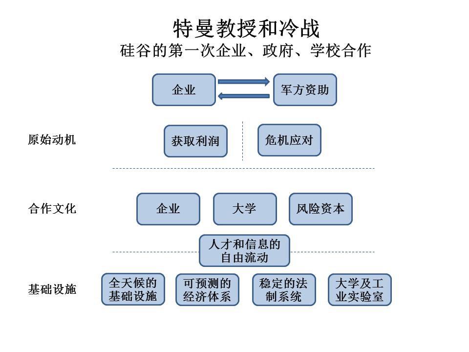 特曼做的这一切成了硅谷的转折点。特曼相信,他在为美国而战,他必须想尽一切办法,使美国成为一个创新式的战争机器。为此,他在1950年中期的斯坦福大学中采取了一系列新规则:鼓励研究生毕业后去创业而不是去读博士;鼓励教授到企业中参与咨询;他本人和其他教授也成为投资理事会的成员;他把技术和知识产权转让变得极为容易,从三年变成了三分钟,谁对斯坦福的科研成果有兴趣,签一个合同就可以拿去;他使实际工作经历成为对学术生涯有利的东西。当时,没有一个学校这么做。特曼有一个至关重要的思想,他不想成为一个军方的制造机器,他只做科研,让他人去建公司,让军方给他们钱去创业,他只提供咨询。这样,有钱出钱,有力出力,有头脑的出头脑,硅谷繁荣了起来,那是1950年代。