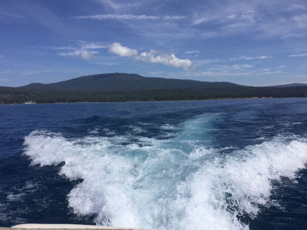 出了码头,小快艇好似离弦的箭,轰鸣着冲向湖心。翻卷的浪花与天上的白云相映成趣,碧蓝的湖水波光粼粼,远处环绕太浩湖的群山被薄雾笼罩着,似隐似现。巨大的湖面上微波轻扰。随着湖水的加深,湖水根据水的深浅折射出不同的颜色,从岸边的淡绿色变成浅蓝色,到湖心的深水处逐渐变成深蓝色。我完全被太浩湖的浩瀚与深邃所震慑,身不由己地站了起来,谁知我刚刚迎风而立,还没来得及护住帽子,一阵风已经把帽子卷走了。我们急忙转舵回来试图打捞,可是已经来不及了,只能眼睁睁地看着我可爱的帽子慢慢地沉入湖底。永别了,我亲爱的帽子。