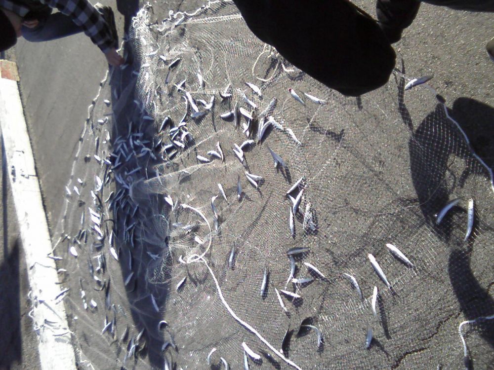 捕鱼是一小年青,这时,他的另外三个同伴凑了上来,帮忙取鱼。