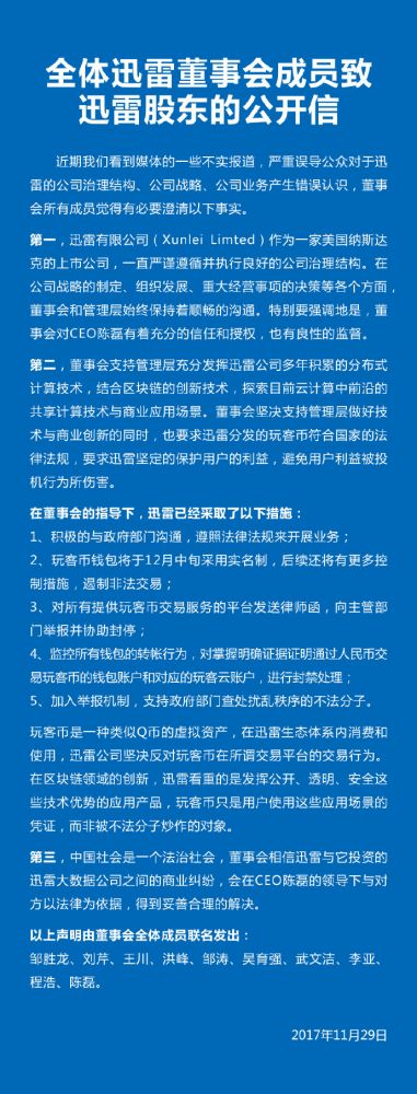 北京时间11月29日早晨,迅雷公司发布“全体迅雷董事会成员致迅雷股东的公开信”,以迅雷董事会的名义背书CEO陈磊和玩客币,并称将在12月对玩客币钱包实行实名制,并且配合监管打击其他交易平台上的玩客币交易行为。